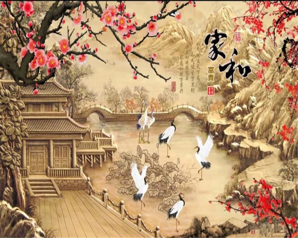 Name: 3d Wallpaper Beibehang Chinese-Style Carved-Flower Custom Relief Frame Crane-Landscape